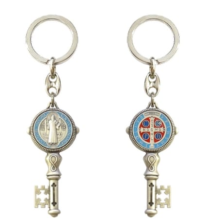 Kovová kľúčenka s kľúčikom, na ktorom je zobrazená benediktínska medaila vo farebnom prevedení.