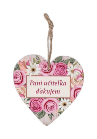 Drevená magnetka v tvare srdca s ružičkami a bielymi kvietkami a nápisom Pani učiteľka ďakujem. Magnetka má rozmer 9 x 9 cm a obsahuje aj krátky špagátik na zavesenie. Odporúčame ako darček na konci školského roka alebo ku Dňu učiteľov.