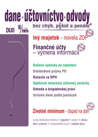 Titul obsahuje príspevky k zmenám v právnych predpisoch z oblastí daní, účtovania a zdaňovania miezd a odvodov. Iný majetok po novele ZDP Výmena informácií o finančných účtoch - nový zákon Daňové výdavky po zaplatení Oslobodené príjmy PO podľa ZDP Ručenie za daň z pridanej hodnoty DPH v daňových výdavkoch - príklady Opätovné otvorenie neschválenej účtovnej závierky Oznámenie o dátume schválenia účtovnej závierky DPH v daňových výdavkoch z pohľadu účtovníctva Nevykonanie dôkazov správcom dane Určenie dane podľa pomôcok Podklady pre rozhodnutie správcu dane v daňovom procese Zmena životného minima - dopad na daň z príjmov Dohoda o brigádnickej práci študentov a štatút študenta Výsledok ročného zúčtovania poistného z hľadiska dane z príjmov Dotácie, podpory, príspevky poskytnuté FO Daňovník s výkonom kreatívneho slobodného povolania – zdaňovanie
