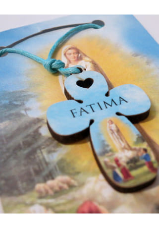 Drevený prívesok na modrej šnúrke - krížik s farebným obrázkom Panny Márie a s nápisom Fatima.