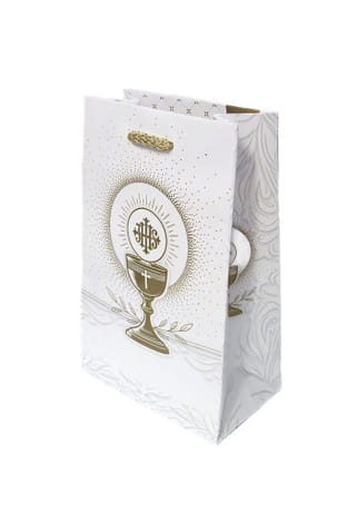 Podčiarknite výnimočnosť sviatočného okamihu elegantnou darčekovou taškou s motívom Sviatosti oltárnej. Jemný biely podklad v kombinácii so zlatými a sivými detailmi vytvára nadčasový, luxusný vzhľad, ktorý zaujme na prvý pohľad.