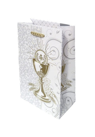 Podčiarknite výnimočnosť sviatočného okamihu elegantnou darčekovou taškou s motívom Sviatosti oltárnej. Jemný biely podklad v kombinácii so zlatými a sivými detailmi vytvára nadčasový, luxusný vzhľad, ktorý zaujme na prvý pohľad.
