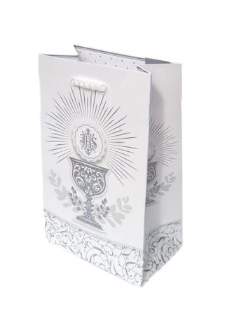 Podčiarknite výnimočnosť sviatočného okamihu elegantnou darčekovou taškou s bohatým motívom kalicha a hostie. Biely podklad v kombinácii so striebornými detailmi pôsobí čisto, jemne a zároveň luxusne.
