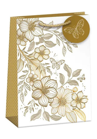 Vkusná darčeková taška so zlatým kvetinovým vzorom pôsobí luxusne a nadčasovo. Kombinácia bieleho podkladu a zlatých detailov spolu s dekoratívnou visačkou s motívom motýľa dodáva darčeku výnimočný a slávnostný vzhľad.