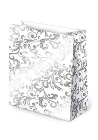 Táto darčeková taška vyniká elegantným a moderným dizajnom v jemných svetlých tónoch, ktoré pôsobia vkusne a nadčasovo. Povrch zdobia bohaté ornamenty zvýraznené lesklou metalickou fóliou, čo taške dodáva luxusný vzhľad.