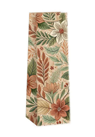 Elegantná darčeková taška na víno s jemným kvetinovým motívom je ideálnym doplnkom pre štýlové zabalenie fľaše. Prírodné farebné tóny v kombinácii s detailnou ilustráciou listov a kvetov pôsobia harmonicky a vkusne, vďaka čomu je taška vhodná na rôzne príležitosti – od osláv až po bežné darovanie.