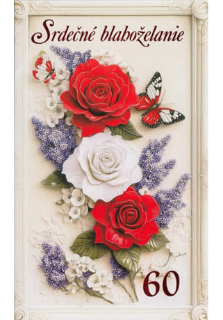 Elegantný gratulačný pozdrav k 60. narodeninám s bohatým kvetinovým motívom ruží a jemných kvetov, doplnený motýľmi. Vkusné prevedenie v svetlých tónoch pôsobí slávnostne a zároveň nežne, ideálne na vyjadrenie srdečných prianí k významnému jubileu.