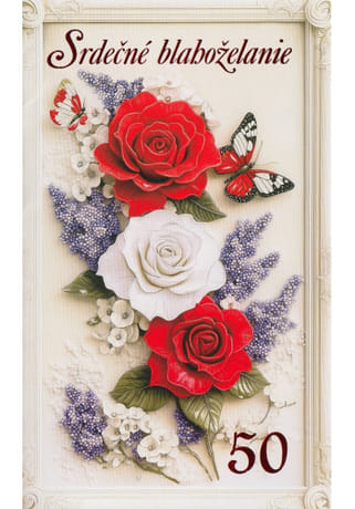Elegantný gratulačný pozdrav k 50. narodeninám s bohatým kvetinovým motívom ruží a jemných kvetov, doplnený motýľmi. Vkusné prevedenie v svetlých tónoch pôsobí slávnostne a zároveň nežne, ideálne na vyjadrenie srdečných prianí k významnému jubileu.