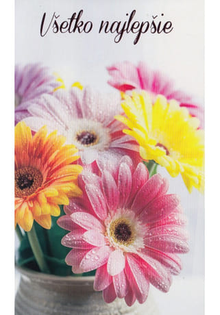 Elegantný gratulačný pozdrav s nápisom „Všetko najlepšie“, zdobený farebnými gerberami vo váze. Svieži a veselý kvetinový motív v žiarivých odtieňoch pôsobí optimisticky a je vhodný na rôzne príležitosti – narodeniny, meniny či iné milé udalosti.