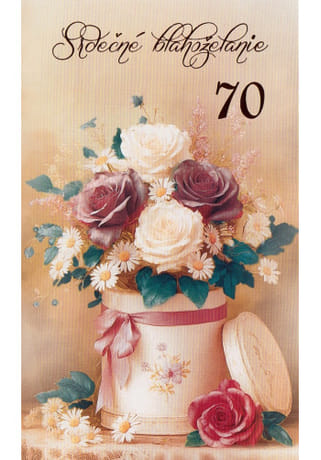 Pekný pozdrav k 70-tke s nápisom Srdečné blahoželanie a motívom kvetov vo váze je krásnym spôsobom, ako vyjadriť úprimné prianie pri narodeninách. Jemný a vkusný dizajn pôsobí slávnostne a poteší každého obdarovaného.