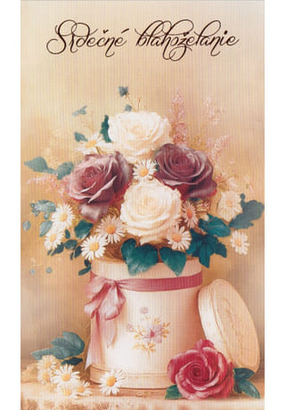 Pekný pozdrav s nápisom Srdečné blahoželanie a motívom kvetov vo váze je krásnym spôsobom, ako vyjadriť úprimné prianie pri narodeninách, meninách či inom sviatku. Jemný a vkusný dizajn pôsobí slávnostne a poteší každého obdarovaného.